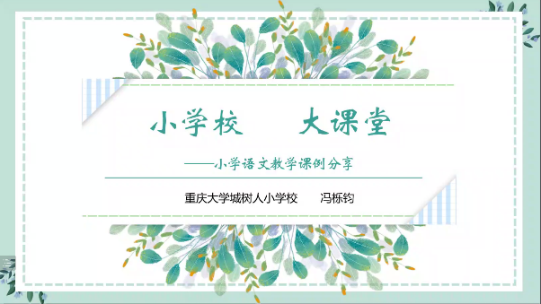 11月17日19:00,重庆大学城树人小学校副校长、特级教师冯栎钧老师研究生作了主题为“小学校、大课堂”的讲座。冯老师先后被评为全国小语十大青年名师、市级骨干教师,在小学语文教学领域有非常丰富的教学经验。