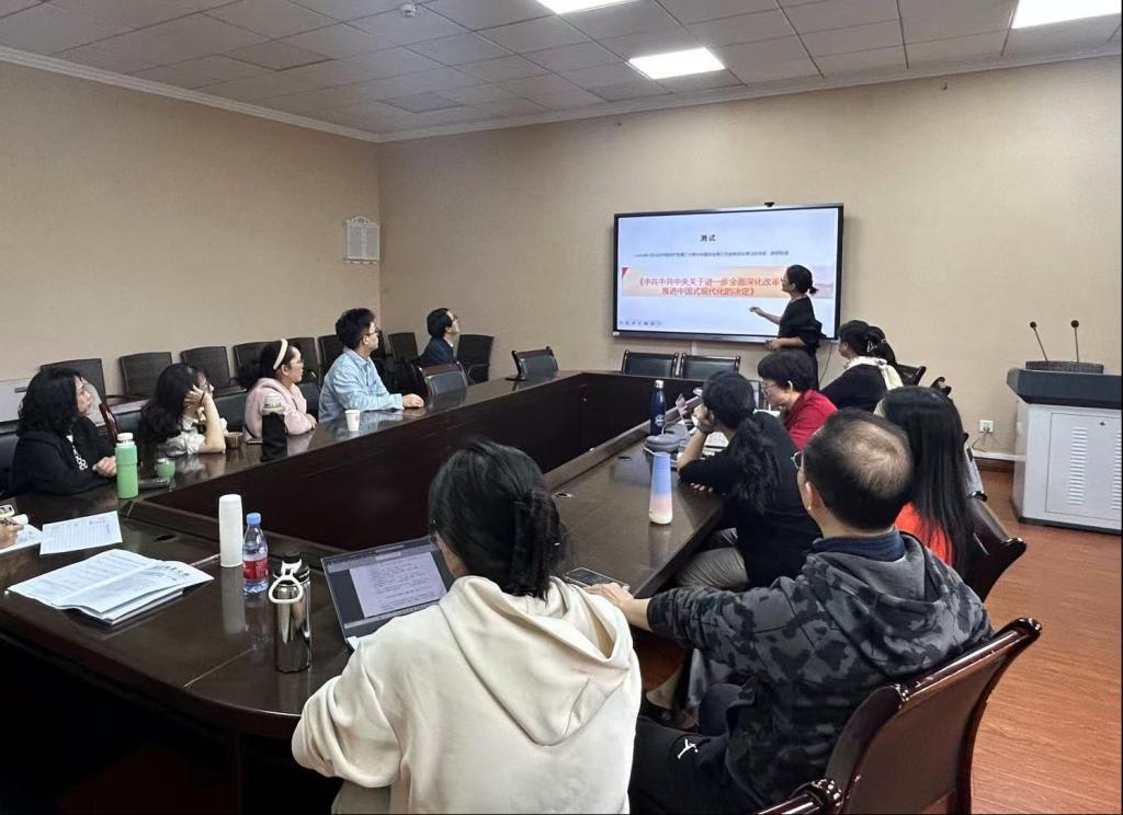 党委教工一支部于励志楼2434开展了“学习贯彻党的二十届三中全会精神”的宣讲与集中学习活动。活动由支部组织委员蔡红梅同志主持,支部书记刘小红同志进行宣讲领学,支部陈世联、左瑞勇、邹旭东等15名党员同志参与活动,深入学习了党的二十届三中全会精神,重点围绕《中共中央关于进一步全面深化改革、推进中国式现代化的决定》(下文简称《决定》)中的关键内容进行研讨。