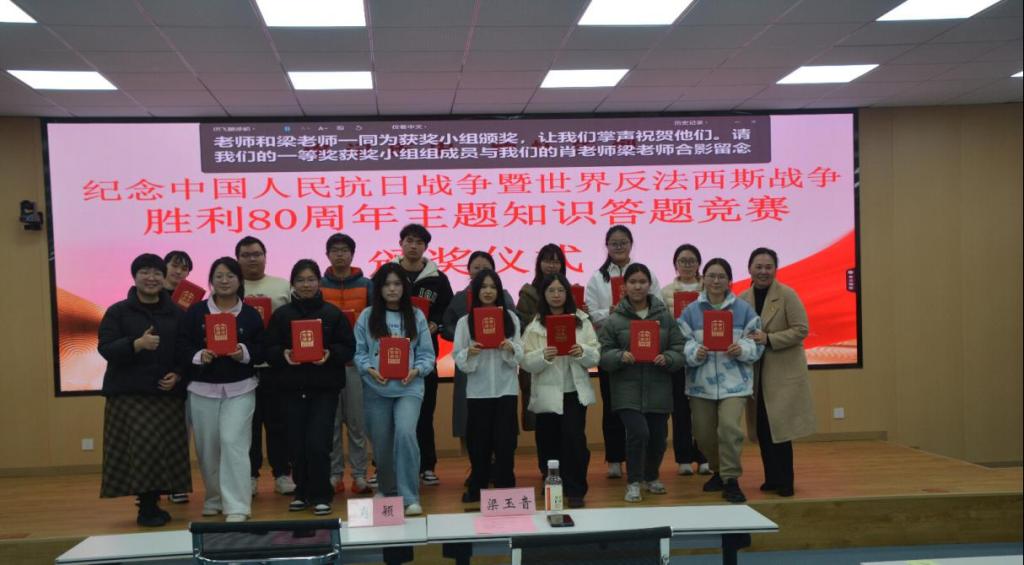 竞赛决赛环节由初赛胜出小组抽签对决,最终评选出一等奖和二等奖,肖颖与梁玉音老师为获奖同学颁奖。活动在全体参会人员合影中落下帷幕。本次主题教育不仅是一次历史重温,更是一次精神动员,激励师生在回望历史中砥砺初心,在新时代征程中勇担使命。